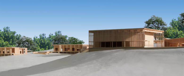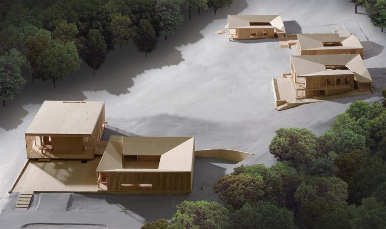 The design process began with a series of very different conceptual approaches to the site plan.  The schemes varied from a single volume along the top of the ridge consolidating the entire program into one building; to a cluster of volumes; to individual cabins and small two-room buildings.  The clustered schemes had the most appeal as they broke down the scale of the program into five buildings and created public, outdoor gathering spaces between them.  Four of the buildings house the administrative functions, reverends and guests and they were conceived as courtyard buildings with complex roof forms – studied in physical and digital structural models.  The Meditation Hall was physically modeled at a very large scale as an exposed structural frame with numerous natural and artificial lighting effects.  The final design tool was a 6 foot long site model that determined the final configuration and positions of the buildings.