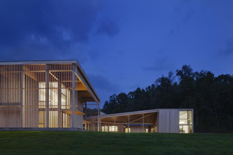 This complex of buildings is notable for its layered approach to exterior and interior spaces and the building envelopes.  The outdoor spaces, decks, and wooden screens create a ‘spatial gradient’ that both engages the landscape and enriches the architectural experience.  The building envelope is not simply a wall, but a series of layered, performative volumes.  This project is also designed as “hyper-green”, where every design decision with respect to energy use is aligned with the organization’s respect for balance and harmony with nature.  Natural daylighting, indirect fluorescent lighting, solar thermal panels, radiant floor heating, geo-thermal wells, through ventilation and water management are used in all buildings.