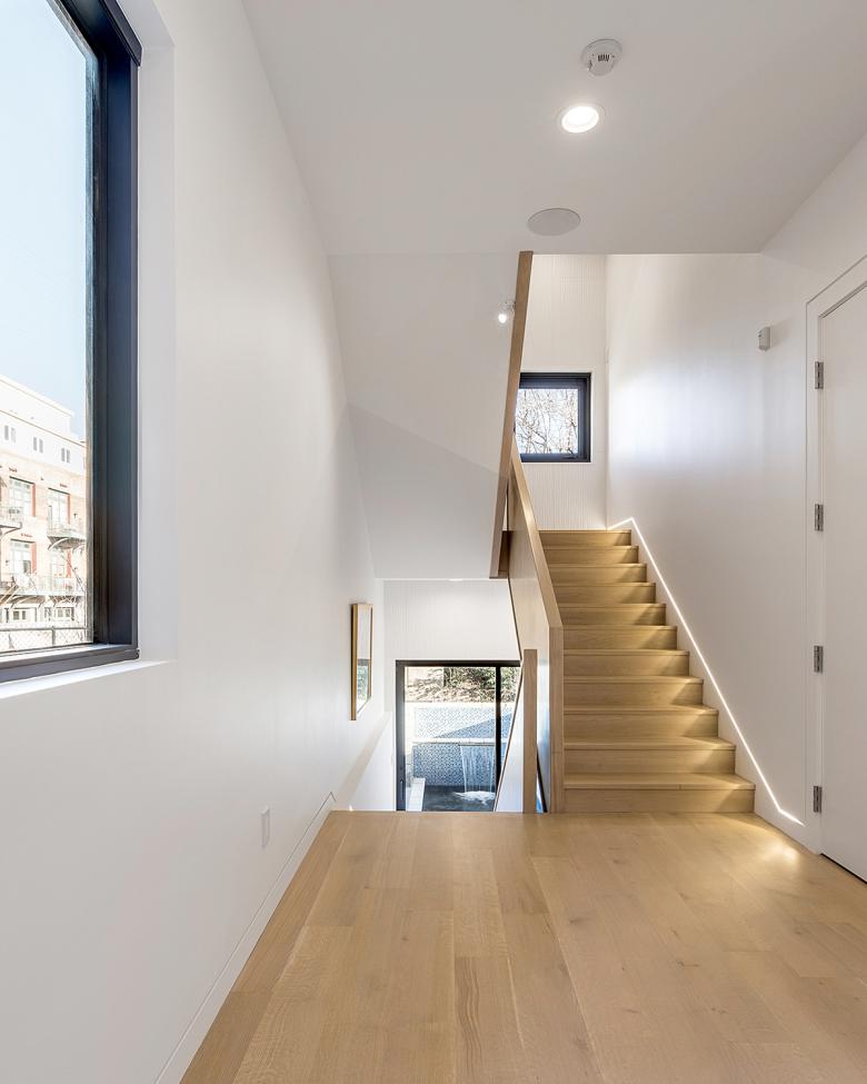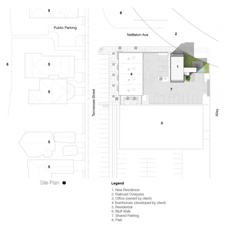 This urban residence is situated within a mixed-use development between the South Main Historic Arts District and the Mississippi River bluff. The small lot was carved from a recently completed development including a re-purposed warehouse into offices and four attached townhomes. The 3,750-sf home consists of four levels: a ground floor garage/office, a second floor suite for the client’s mother and her caregiver, living and kitchen on the third, and a master suite on the fourth floor. The compact site exists between a railroad overpass to the north and an alley to the east, allowing shared vehicular access to the home.