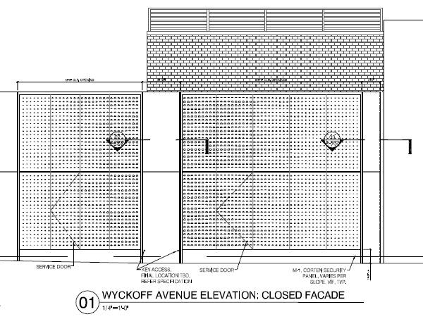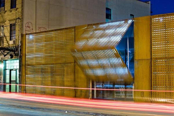 The design solution is highly inventive, relying upon motorized scissor door technology adapted from airplane hangars and factory buildings. The five pairs of moving façade panels create an ever-changing expression of tectonics and purpose. By day the panels fold up to create awnings for the stores and to shelter pedestrians. By night they secure the shops behind them and create an artful façade defined by a glowing abstract gradient pattern of internally illuminated laser-cut Cor-ten and stainless steel. This enigmatic work of art, executed on an urban scale, defines the Wyckoff Exchange as more than just a commercial structure.