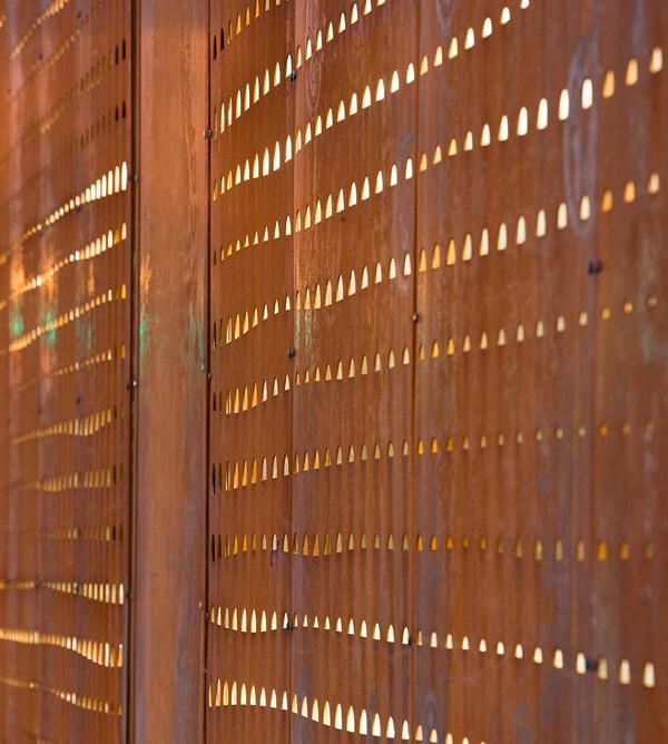 We chose materials for this façade that are both industrial and artistic. Our focused use of just two materials was deliberate to define this building and elevate the urban quality and character of the neighborhood to something more. When we completed the building we realized just how appropriate those materials are -- at dusk, the surface quality of the raw Cor-ten steel is elegantly transformed into a Rothko-like canvas by the setting sun, while at night the shimmering layer of perforated stainless steel just two inches behind it forms a perfect complement (when the internal LED lights are illuminated).