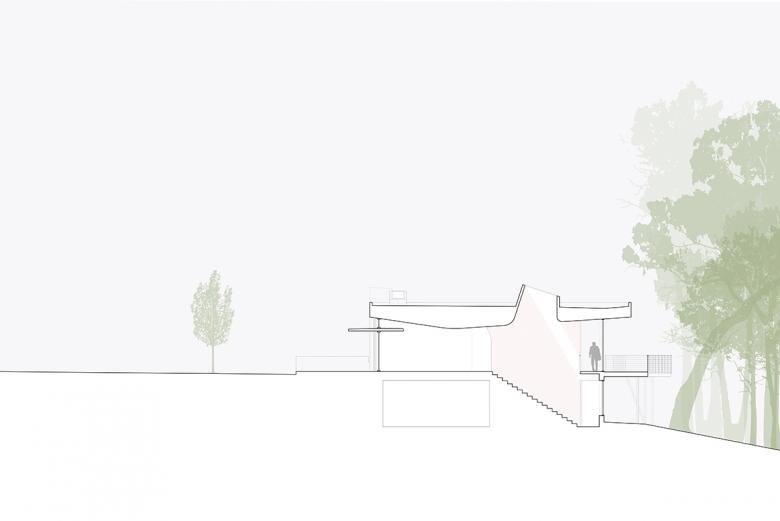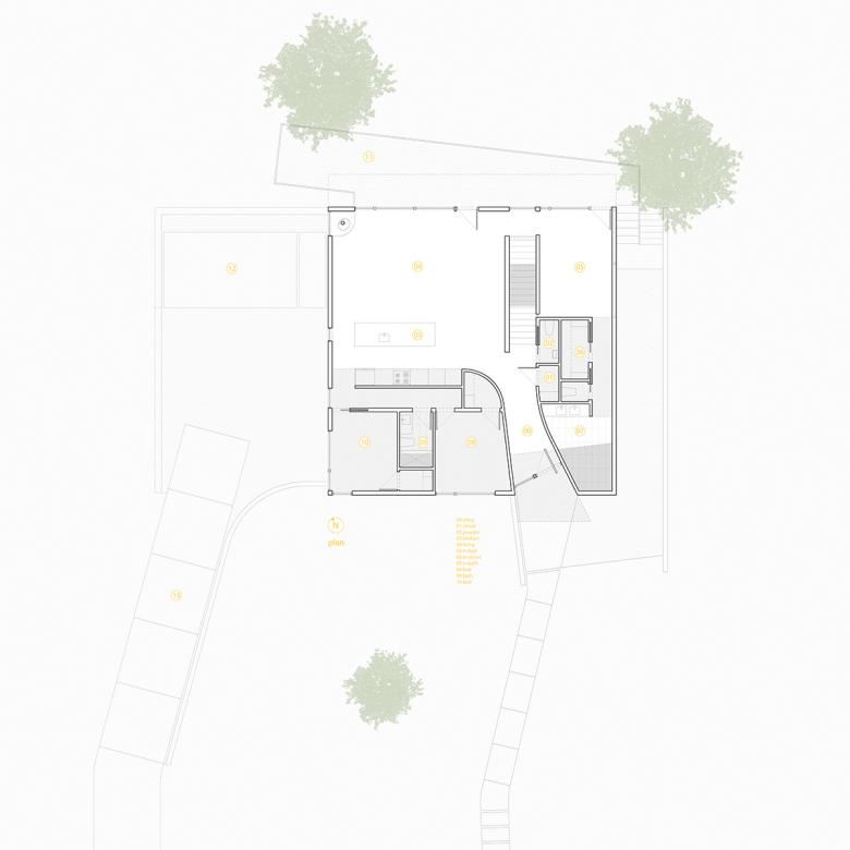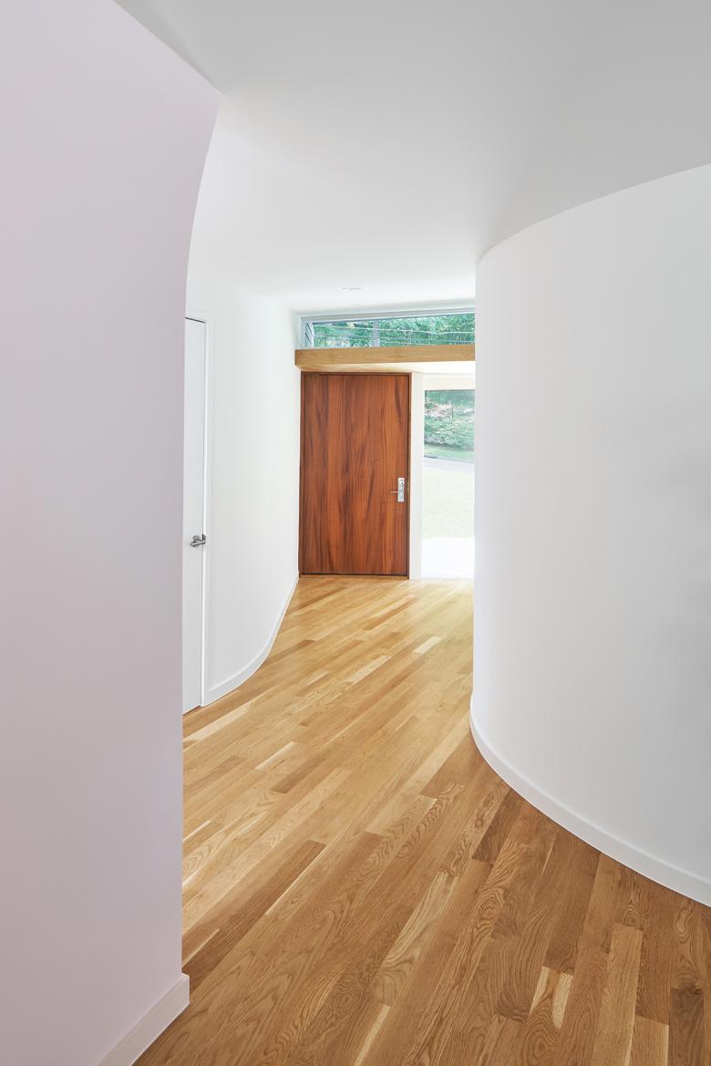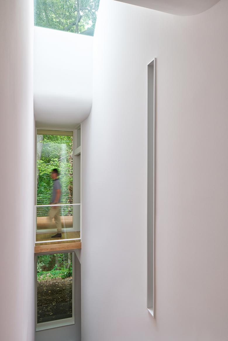 The Yamato Philbeck Residence is located at the edge of a deep ravine, between the forest and a suburban street. Four site walls create a perch for the main volume of the house – a spare box with articulated roof forms. The curvaceous entry and stair spaces are accessed at the southeast corner of the plan and direct movement towards the open north wall of the main living space, an elevated deck, and views of the forest and ravine. The boxy exterior of the house shrouds a voluptuous and porous interior.