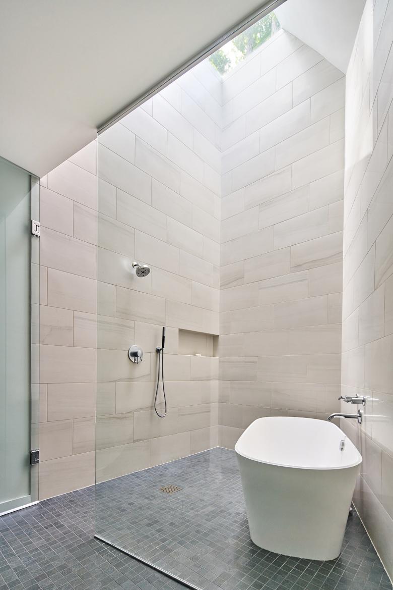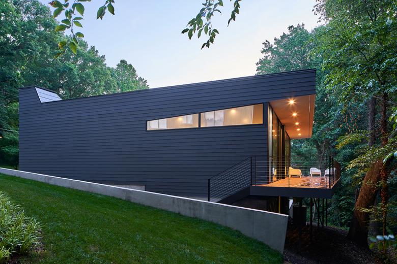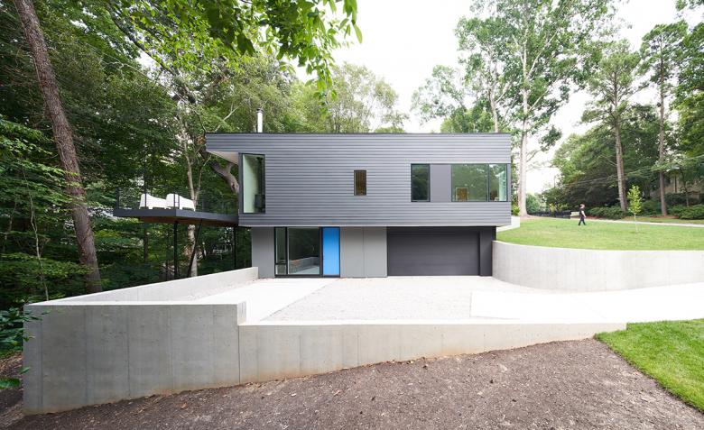 Four cast-in-place concrete site walls create a perch for the main volume of the house on the dramatically sloped site and retain terraces that accommodate the entry walk, driveway, lower patio, and site stair from the deck to the rear yard. The structure of the house is made entirely of wood, aside from a handful of delicate steel columns supporting the elevated rear deck. Exterior materials are humble: unadorned concrete foundations, cementitious siding, stucco, aluminum-clad residential windows, and brake metal. The interior is made of wood floors, painted sheetrock, and simple tile. The house utilizes a handful of passive sustainable “technologies” – natural lighting, natural ventilation, an SPFI envelope, and a white roof. With this simple palette, the house hopes to offer a reminder that good space can be made from the most basic materials.