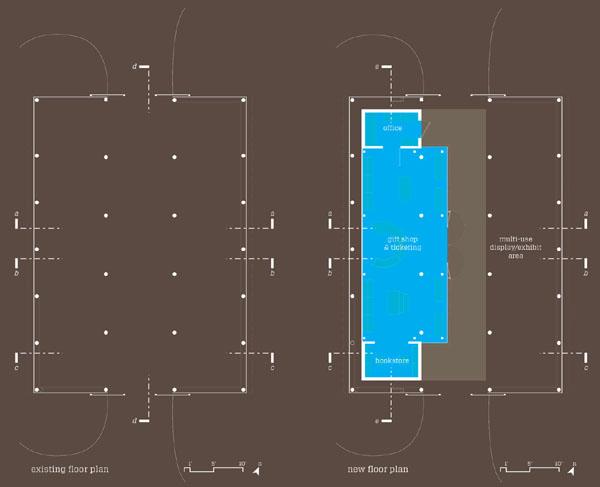 Floor Plan (existing & new): As a ‘building-within-a-building’, programmatic components of the Visitor Center are physically autonomous from the original tobacco barn.
