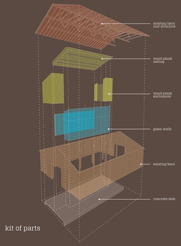 Kit-Of-Parts (exploded axonometric): Diagram of primary elements inserted within the original tobacco barn.