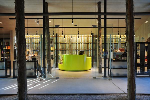 View Of Gift Shop From Display/Exhibit Area (in foreground): New interior walls are clearly differentiated from the existing barn through a light milk paint finish.