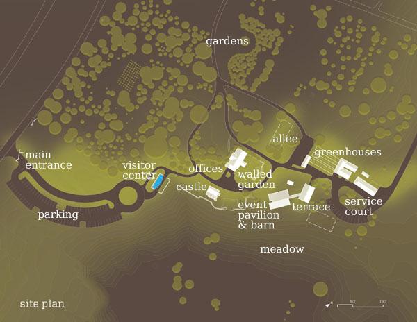 Site Plan: The new Visitor Center, incorporating an existing tobacco barn, is the first of numerous structures original to the property.