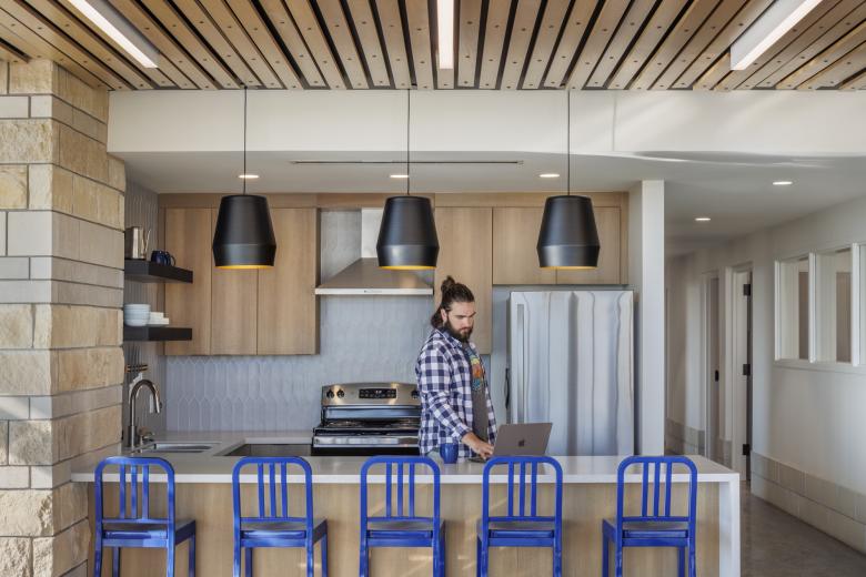 The appearance and interior details of the Youngmeyer Ranch Field Station are inspired by the stratified stone underneath the surface of the Flint Hills. Finish materials are all natural tones, organized in patterns to evoke layers of sediment, heads of grain, or even the night sky.