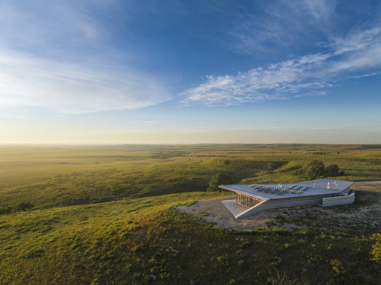 Utilizing the same limestone quartz that exists in the area allows the building to use a sustainable, functional building material while maintaining the intended camouflage effect. Four varieties of natural limestone were used on the project, all harvested from Kansas quarries. One variety, Prairie Shell, includes many fossilized shells that tell the story of a prehistoric era. Visitors can take a scavenger hunt around the building for fossils preserved and on display in the walls.
