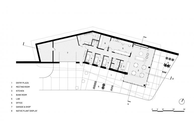 A field research and retreat center in the Flint Hills demands both integration with the natural environment and the fortitude to withstand natural forces. The Youngmeyer Field Station — an entirely off-grid, 3,400-square-foot cast-in-place concrete structure in rural eastern Kansas — appears to grow out of a rocky bluff.