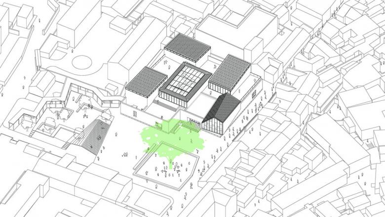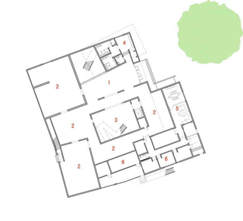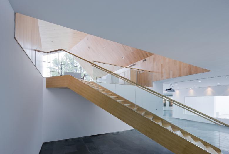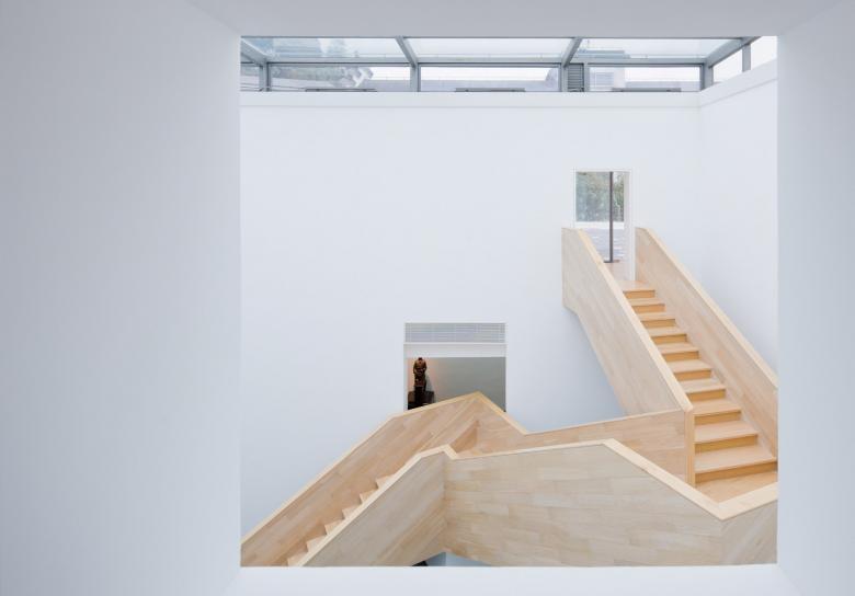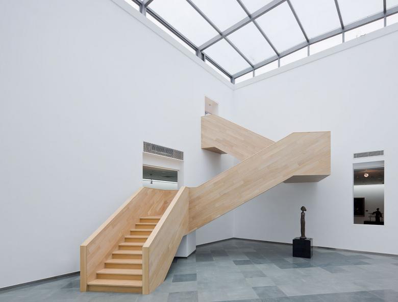 Split into several volumes, the mass of the museum is grouped around a central atrium with a glass roof. Here an open zigzag stairway made of wood, stands like an abstract sculpture in the open space. The main exhibition space is places at the ground floor around the central court. On the first floor an internal circulation around the atrium links several smaller units and open courts for special exhibitions and events.