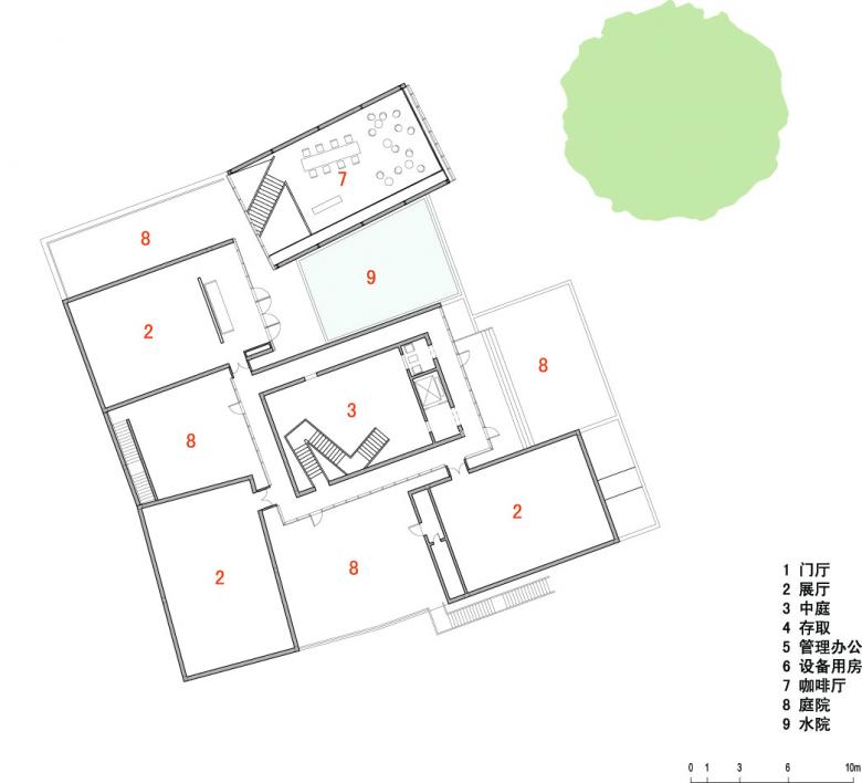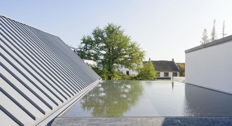 The reference of the figure-ground texture of the old town can be seen in the relationship of court and building mass. The different parts of the building are sensibly turned to their neighbouring building. This has the effect that the rectangular boxes slightly interact with the urban structure. To honour the old gingko tree on the public plaza in front of the museum, a reflection pool on the second floor mirrors the tree into the space of the museum. The white washed walls of the building are a reference to the traditional local architectural style.
