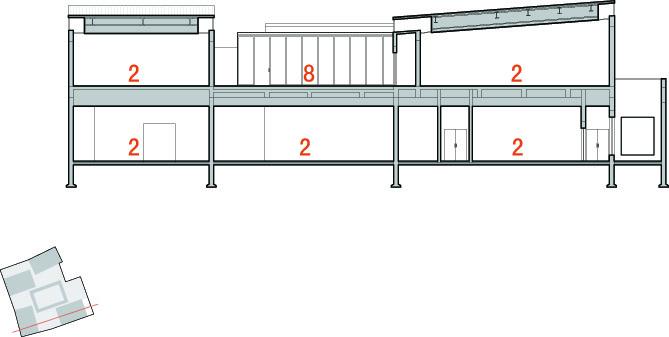 The huge glass fronts on the second floor open the building to the surrounding and invite the people for a visit. The interconnected interior space gets its daylight from those huge openings. Whereas the buildings on the first floor is rather closed to the outside, in order to get the most space for the placement of paintings, the opening on the second floor, work in two ways: first they give daylight to the interior space and second they open the building to the passers-by.