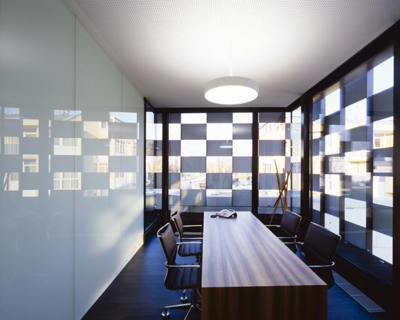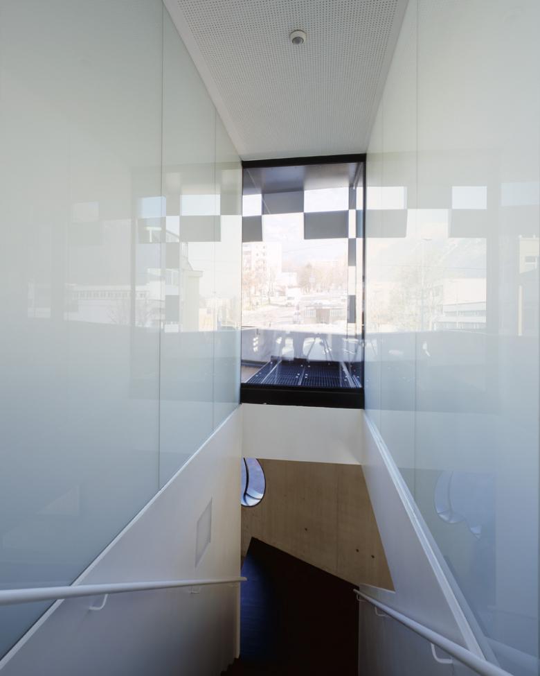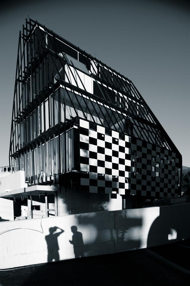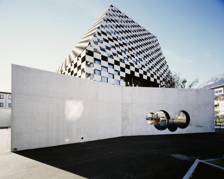 Die Form wird durch ein markantes Fassadenmuster überhöht: wie ein Schachbrett besteht die äußere Fassadenhülle aus rechteckigen, betonfarbenen Fassadenplatten aus glasfaserverstärktem Beton, die sich mit gleichgroßen, schwarzen Luftlöchern abwechseln. Um die Größe der einzelnen Platten besser abschätzen zu können, so erzählt Köberl, sei er nach Vaduz gefahren, wo Hans Jörg Göritz für das Landesforum und Landesparlament des Fürstentums Liechtenstein eine ähnlich steil aufragende und spitzzulaufende Dachform – hier aber aus kleinformatigen Ziegeln - realisiert hat.