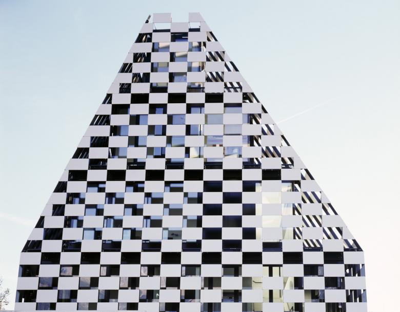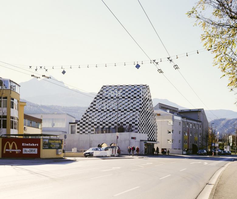 Schwarze und weiße Rechtecke ergießen sich in einem regelmäßigen Muster über das Haus. Es erinnert an ein Schachbrett, hat aber auch etwas von den weiß verschneiten Bergen, die Innsbruck umringen.