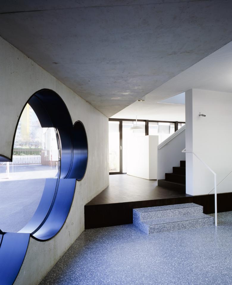 Eine Betonmauer, die sanft ansteigend parallel zur Tiefgarageneinfahrt beginnt, wickelt sich mit einem gewissen Abstand einmal um den ganzen Bau herum, um dann auf der Ostseite doch noch auf Tuchfühlung mit dem Baukörper zu gehen. Kreisförmige Fenster sind hier in die Wand eingeschnitten, sie gewähren Ein- und Ausblicke in den öffentlicheren Teil der Bank. Ansonsten nämlich schützt die Mauer die Arbeitsplätze im Erdgeschoss vor direkten Einblicken, lässt aber durch den Abstand genug Licht rein und schafft einen kleinen, begrünten Innenhof.