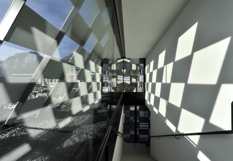 An diesem sind auch die Stahlschwerter befestigt,die wiederum die Glasfaserbetonplatten halten. Von außen gewährt diese Netzhaus kaum Einblicke in das Inneren, von Innen hingegen stören die dunklen Quadrate den Blick nach außen kaum – sie helfen vielmehr die häßlichen Nachbarbauten auszublenden und sich auf Schönes wie zum Beispiel auf die Bergsilhouette zu konzentrieren.