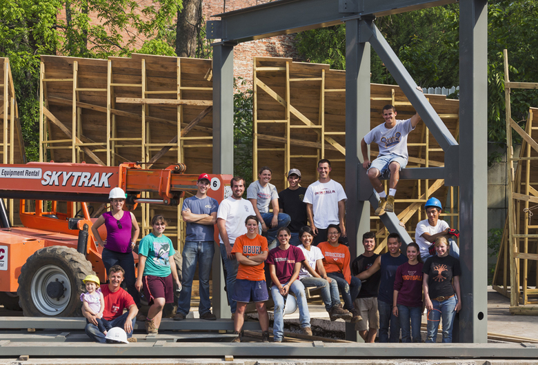 For the Masonic Amphitheatre Project the 16 students (Tyler Atkins, Lauren Duda, Huy Duong, Derek Ellison, Megumi Ezure, Katherine Harpst, Kyle Lee, Leo Naegele, Margaret Nelson, Leah Schaffer, Ian Shelton, Brent Sikora, Emarie Skelton, Samantha Stephenson, Taylor Terrill, Samantha Yeh) prefabricated modules in Blacksburg, the home of Virgina Tech, and erected the pieces on site, as can be seen in Jeff Goldberg's time-lapse video of the construction: