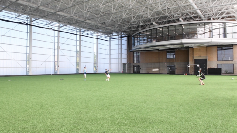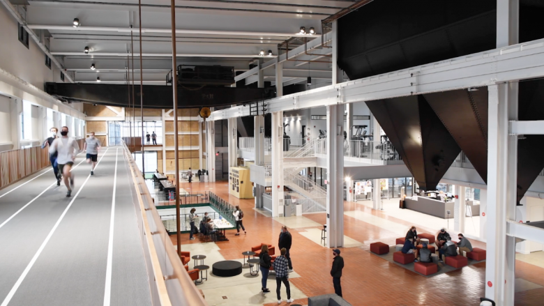 A field house behind insulated panels is Gang's addition, where the running track pops out from the old turbine hall building. (Photo: Screenshot)
