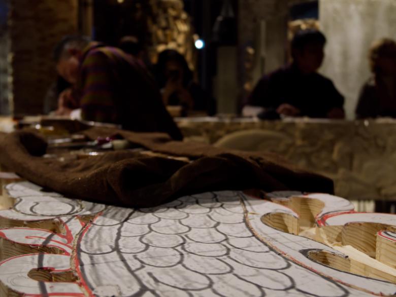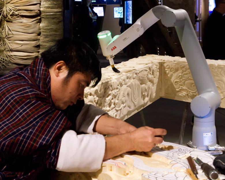 Ancient Future: Bridging Bhutan's Tradition and Innovation was one of the more performative pieces in the Biennale during the vernissage and ahead of its opening on May 10. The carvings visible on the sides of the beams were completed ahead of the Biennale, but two Bhutanese woodcarvers—Sangay Thsering and Yeshi Gyeltshen, per BIG—worked on the top surfaces, while a robotic arm cleared away wood shavings and dust. Although the film shows the robotic arm working with drill bits, safety concerns in Venice led the team to equip it with just a brush.