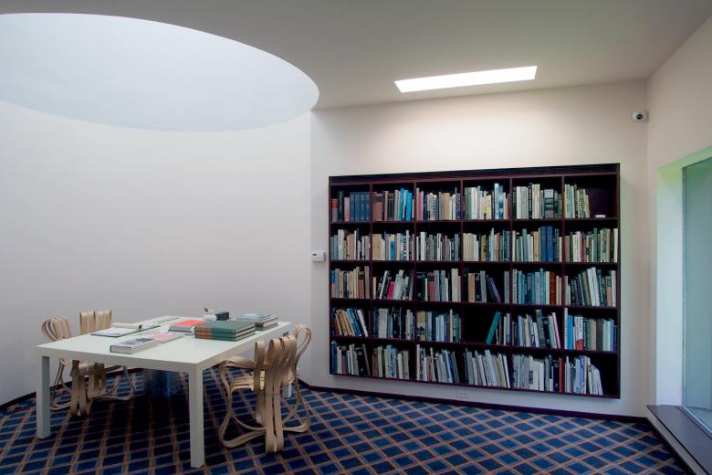 Johnson, who died in 2005 and donated his estate to the National Trust for Historic Preservation, built the Studio in 1980, more than 30 years after the iconic Glass House that gives the property its name. The small library and office is the apparent antithesis of the Glass House, with brick walls and just three openings: the entrance door, a skylight over the desk, and a window framing a view of the Ghost House.