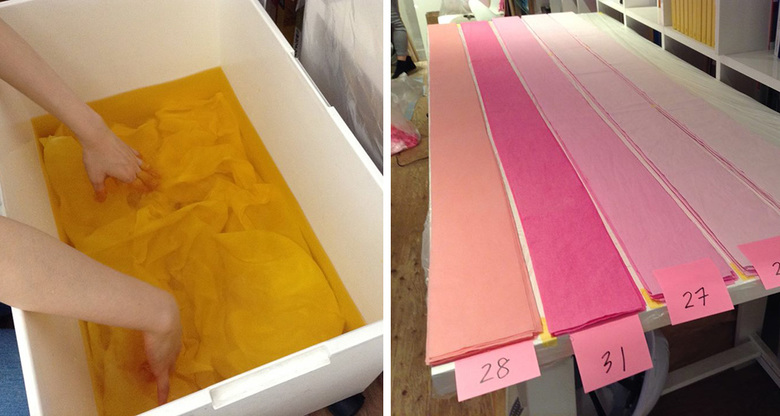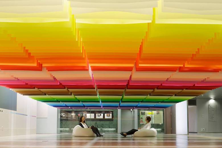 In her work Emmanuelle Moureaux, born in France and based in Japan, focuses on the concept of shikiri – "dividing and creating space through colors." For her, "colors [are] three-dimensional elements, like layers, in order to create spaces, not as a finishing touch applied to surfaces." With her latest "100 Color" installation (last year a version appeared in the Shinjuku Mitsui Building as part of the Shinjuku Creators Festa 2013, photo at bottom) the colors were determined and created in her studio by dying fabric and cutting them into strips.