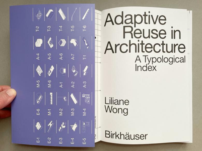 The front and back flaps of Adaptive Reuse in Architecture: A Typological Index feature thumbnail diagrams of the projects detailed in the typological chapters.
