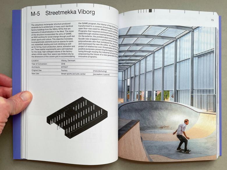 Although Wong defines and describes numerous host structure types (entity, shell, semi-ruin, fragmented, relic, group) and then illustrates projects that fit them, Extending the Lives of Buildings is not a survey that architects or architecture students can mine for inspiration. While certain projects recur throughout the book as seminal examples of adaptive reuse (e.g., Michelangelo's Santa Maria degli Angeli e dei Martiri, Sverre Fehn's Hedmark Museum, David Chipperfield's Neues Museum, Peter Zumthor's Kolumba, etc.), readers must venture elsewhere for additional illustrations and information on these and other projects of interest … or delve into Adaptive Reuse in Architecture: A Typological Index. Published by Birkhäuser in 2023, this second book by Lilian Wong finds much overlap with Extending the Lives of Buildings but takes a more methodical approach to the subject and the documentation of precedents within. The book uses graphs, lists, texts, and brief case studies of notable projects to focus on a half-dozen typologies that have become hosts in transformations to other uses by guests over the last half-century.