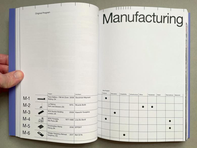 The chapter on manufacturing in Adaptive Reuse in Architecture: A Typological Index includes La Fabrica, the transformation of a cement factory into the office of Ricardo Bofill Taller de Arquitectura that began in the mid-1970s.