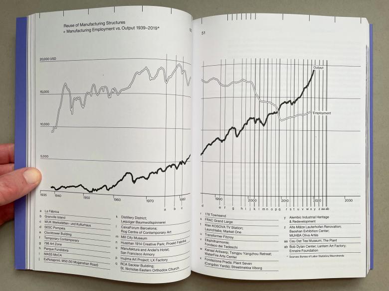 … and a graph overlaying a longer list of adaptive reuse projects with a relevant statistic—in the case of the manufacturing chapter, it is employment and output—over a timeframe encompassing the 50-year span of the book's subject.