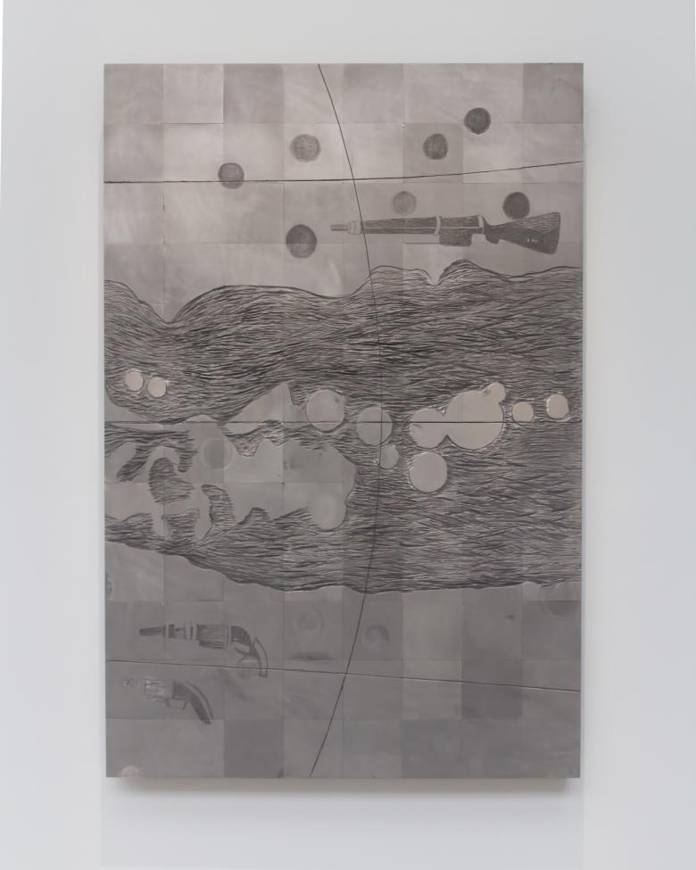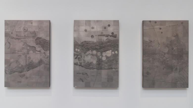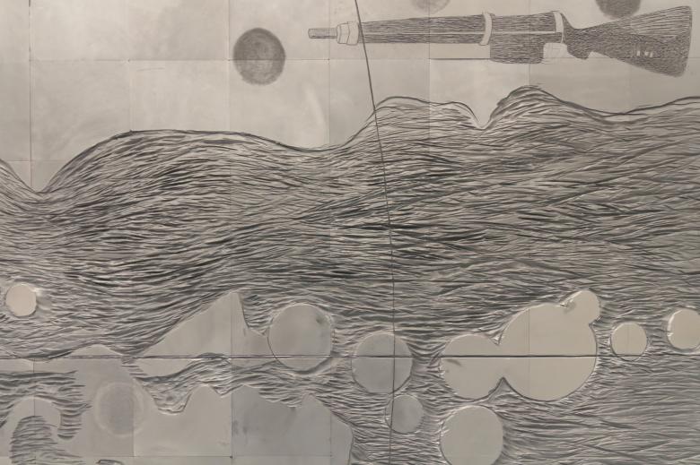 Thandi Loewenson was recognized by the international jury for her contribution to the main exhibition, The Uhuru Catalogs, which, in their citation, “materializes spatial histories of land struggles, extraction, and liberation through the medium of graphite.” It articulates the intertwining of decolonization and decarbonization more effectively than any piece in the Biennale. Medium is the message, as the drawings are composed on blocks of industrial graphite, the material typically used in the production of lithium-ion batteries and therefore in short supply due to increased global demand. “Here, graphite is put to use as a conduit, a charged medium,” Loewenson writes, “that aims to energize a consciousness of the conjoined terrains of earth and air in movements for climate justice and equitable futures for all.”