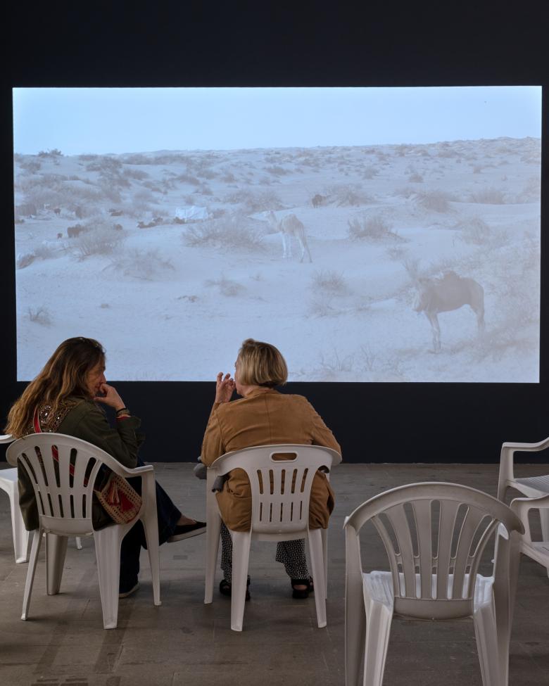 What does it mean to have a Biennale with so many films? Visitors have numerous chances to sit down, take a break from the long walk through the exhibition, and watch what are in the majority short films. (That said, the distribution of the filmic contributions is not even; it is clustered toward the latter half of the long Corderie and in the perpendicular Artigliere.) But these contributions ask a lot from visitors, who can walk by drawings or models at their own pace and own level of engagement, but might be more inclined to engage with the films aping for their attention via sound as well as image. Yet it's not hard to imagine that many of the films could be available online, on YouTube or Vimeo, if not now then in the future, to be watched at will after the Biennale. Therefore the best filmic pieces are integrated with the setting and/or the content, as in the examples shown here. Among them, DAAR's Golden Lion-winning Ente di Decolonizzazione - Borgo Rizza stands out: The film explains the shape of the seating that visitors engage with and expands the exhibit temporally and spatially well outside the confines of the Arsenale.