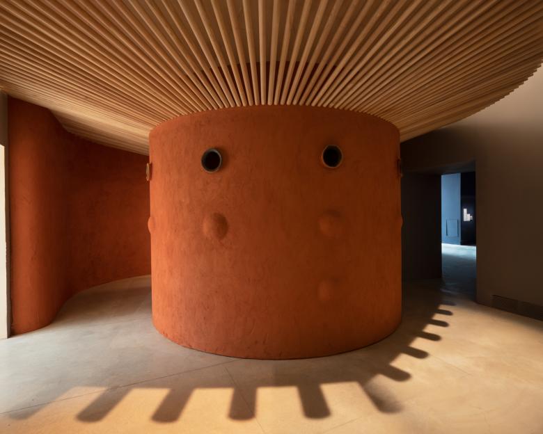 Much like Lesley Lokko is the first person of African descent to curate the Venice Architecture Biennale, architect Diébédo Francis Kéré is the first African and Black winner of the Pritzker Architecture Prize. With such credentials, it's no surprise the 2022 laureate's contribution cannot be contained within one gallery within the Central Pavilion. Counteract's earthen walls snake from a large gallery it shares with Thandi Loewenson's graphite etchings to a small gallery, where its curved walls form a circular seating area inside and are capped by a dramatic roof on the outside. It's a modest yet beautiful installation that encourages visitors to get close to it via small videos housed within round portals in the walls. The look, feel, and even smell of the walls are rich, presented as a “‘counteract’ to the chase for modern architecture,” per the catalog, and a celebration of “West African architectural prowess of the past.”