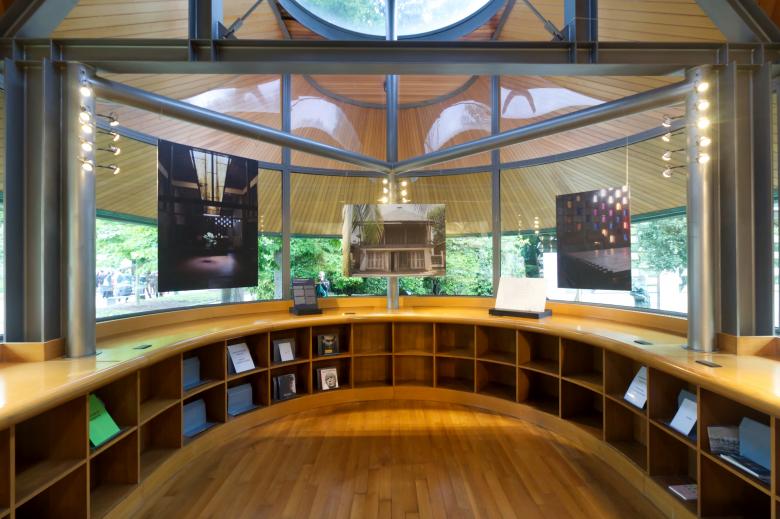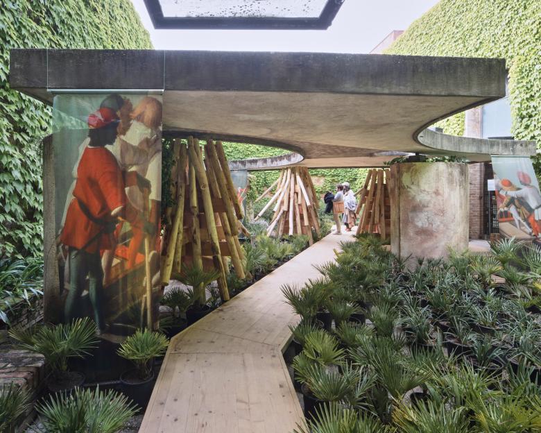 An unexpected intervention is found in the Central Pavilion's outdoor sculpture garden that was redesigned by Carlo Scarpa in 1952 with paving, two small pools, and a curved canopy supported on three columns. Landscape architect Walter Hood softened the space with a layer of plantings, curious columns made from splayed timber pieces, wooden walkways, and graphic panels appearing to depict gondoliers from past eras. Native(s) Lifeways is an expression of Hood Design Studio's project for Phillips, a small Black community near Charleston, South Carolina; it is accompanied by an in-depth presentation of the project within the Central Pavilion. The columns, the most overly interesting part of the design, were inspired by the large rice-toting baskets that men used for harvesting on the former plantation that Phillips occupies.