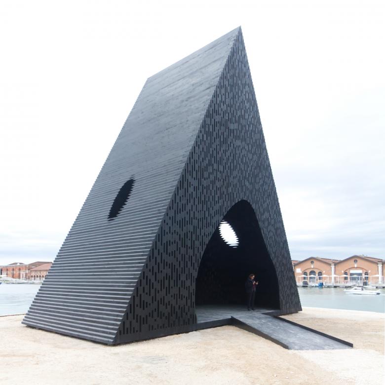 Easily the largest contribution to the International Architecture Exhibition is the wedge-shaped timber pavilion designed by Adjaye Associates and placed as a freestanding object at the far end of the Arsenale. Though large, Kwaeε is actually just one of four contributions by David Adjaye, who has a room with films at the entrance to the Central Pavilion, a gallery with models of a few architectural projects, and his firm's just unveiled proposal for the Kiran Nadar Museum of Art in India. Kwaeε is “envisioned as a space for both reflection and active programming,” per the catalog, designed as a cave-like space punctuated by two oculi. Made entirely from darkened wood, the structure was made to host lectures and panel discussions but also as “a space for archival auditory experiences.”