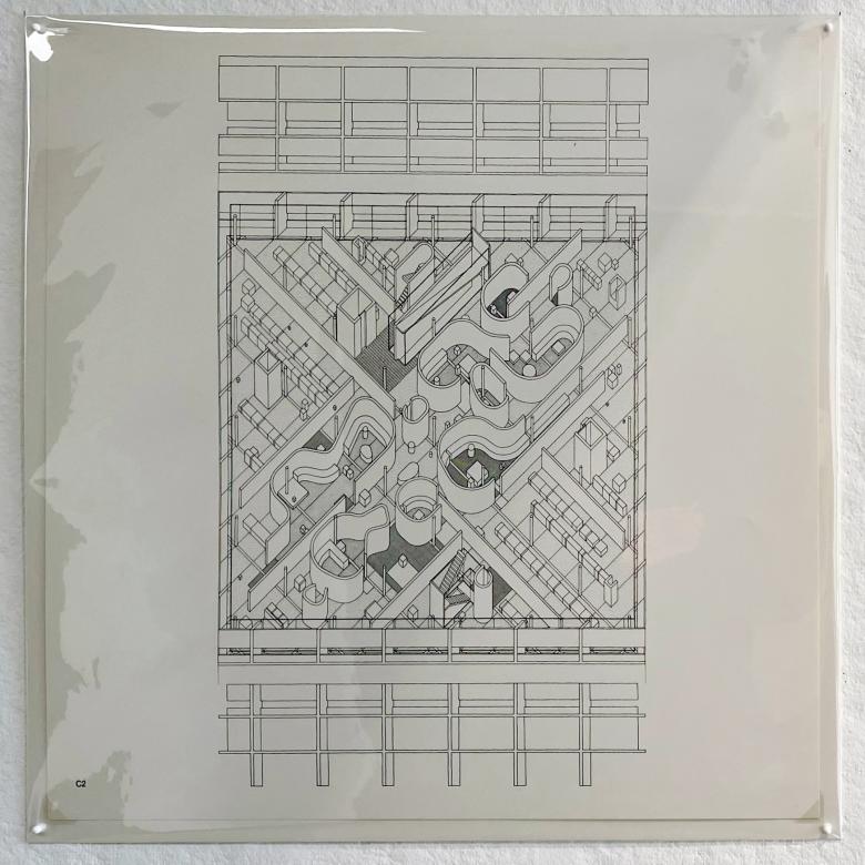 The Three Projects publication consists of Hedjuk’s Diamond Houses A and B, as well as the Diamond Museum, documented on 35 18-inch-square plates, all of which are carefully mounted behind acetate on the walls of the third-floor corridor.