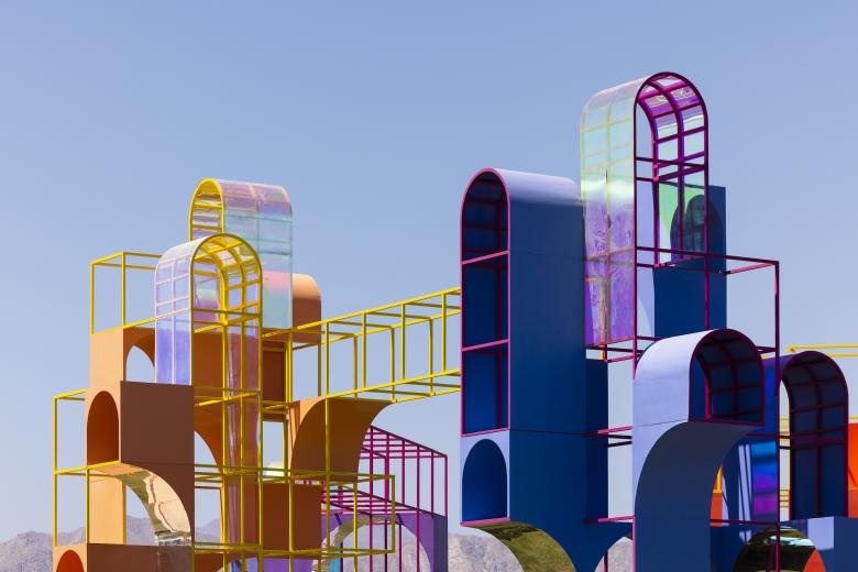 There must be something about Southern California's Coachella Valley that inspires artists and designers to tap into every color of the rainbow: in 2019, the last time the festival was held, the standout contribution was Francis Kéré's Sarbalé Ke, a dozen towers in triangles of color. Architension's The Playground continues that "tradition," as explored below in a few photographs.
