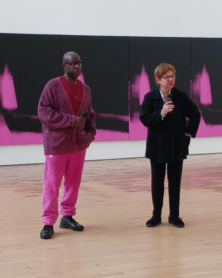 Steve McQueen and Dia curator Donna De Salvo in front of Andy Warhol's Shadows (1978–79) at Dia Beacon on May 10, 2024. (Photo: John Hill/World-Architects)
