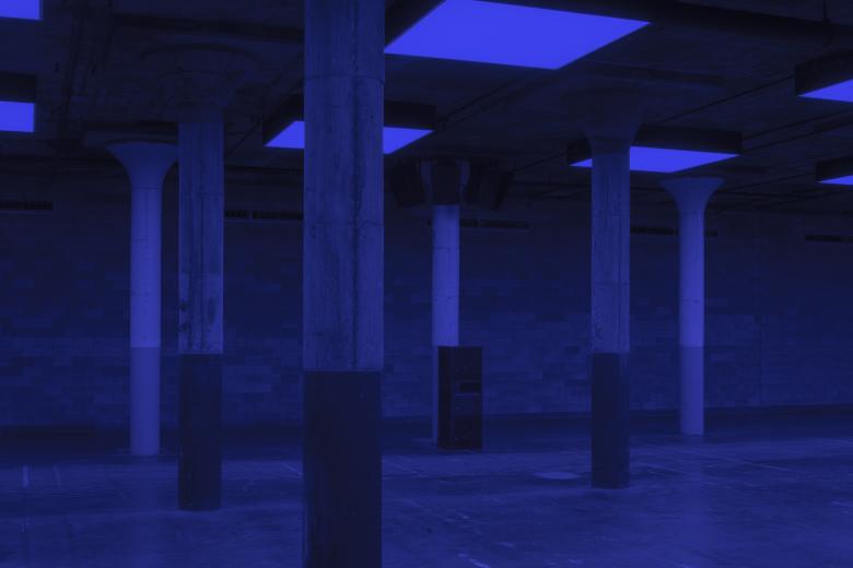 Dia Beacon is housed in a former Nabisco printing plant in Beacon, a 90-minute train ride from Manhattan. The windowless 35,000-square-foot (3,250-m2) space that is home to Bass, with mushroom-capped concrete columns and faint white lines painted on the concrete floor, looks like it must have served as a parking garage or some other mundane use in its first incarnation. Mundanity has given way to profundity in Bass, as slowly changing colors of light and droning bass envelop visitors, making them hyperaware of themselves and those around them.