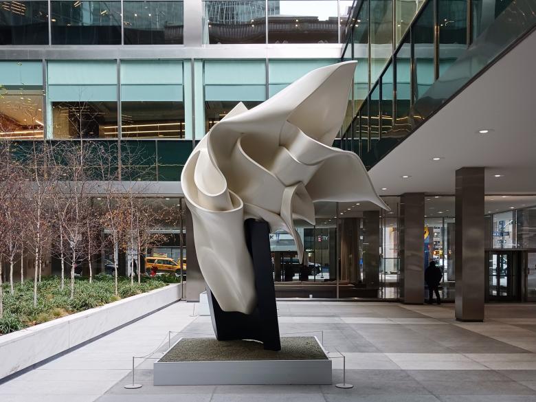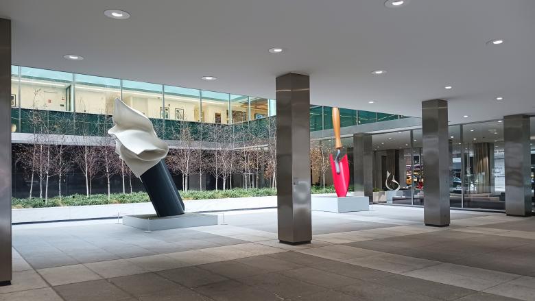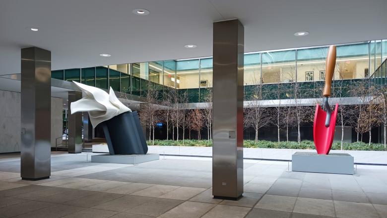 As presented by Brookfield Properties and WatermanClark, in conjunction with Paula Cooper Gallery, Claes Oldenburg & Coosje van Bruggen at Lever House is “the first significant presentation of the artists’ work since Oldenburg’s death in 2022.” In addition to Architect’s Handkerchief from 1999 and the more recent Plantoir, Red (Mid-Scale), done between 2001 and 2021, the year-long exhibition that opened last November includes sculptures, posters, and sketches in Lever House's lobby. One of the first glass-walled International Style office buildings in the United States, Lever House was designed by Skidmore, Owings & Merril in 1952 for Unilever. It was recently restored by SOM for Brookfield and WatermanClark, who took possession of the building in 2020. Based on the current exhibition and the Ellsworth Kelly sculptures on display in the plaza and lobby at the time of our visit in 2023, it seems the new owners are striving to make the ground floor of the modern masterpiece a Midtown destination for art aficionados.
