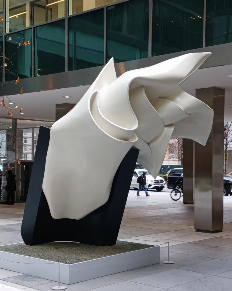 Turns out the artists were inspired by none other than Ludwig Mies van der Rohe: Architect’s Handkerchief is a 12-foot (3.6m) tall depiction of Mies's pocket handkerchief, specifically as captured by photographer Morley Baer and presented in the pages of Peter Blake's 1960 book The Master Builders: Le Corbusier, Mies van der Rohe, Frank Lloyd Wright. Although it is not included in the lobby display, Oldenburg made a collage in 1997 that shows his sketch for the sculpture next to a crop of Baer's photo. The collage, a screenprint and chine collé, is in the collection of the Madison Museum of Contemporary Art, while the sculpture itself is one of three that were made; one of them is permanently displayed in front of the Kemper Museum of Contemporary Art in Kansas City, Missouri, while this one was brought to Midtown Manhattan from Chicago, in front of Mies's 560–580 Lake Shore Drive (this writer could not determine the location of the third).