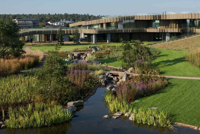 A lower view from the house toward the Moskva River makes the layering of landscape and building clear, but also the merging of the two. It's easy to imagine getting up from a lounge chair and walking down the sloped roof directly into the garden that sits buffers the house from the river. (Photo © Ilya Ivanov)