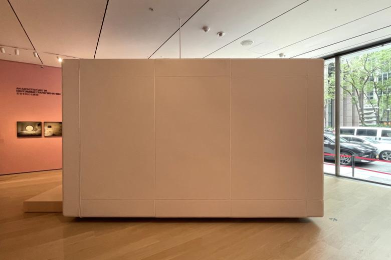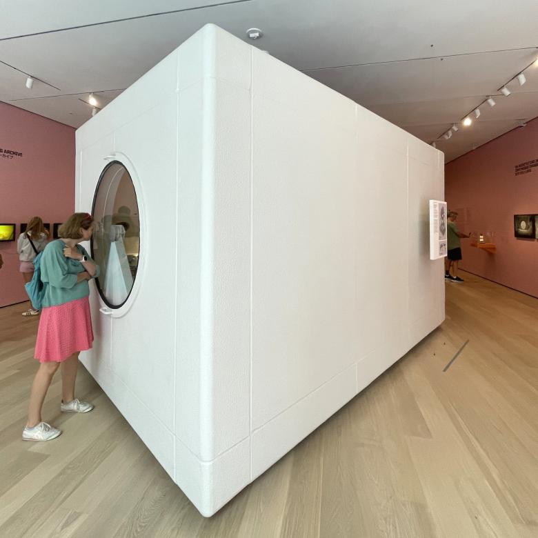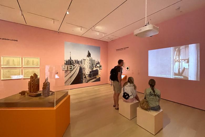 The second gallery, visible to passersby on West 53rd Street, jumps forward to the Nakagin Capsule Tower ahead of its 2022 demolition, as revealed in photographs, videos, and an interactive virtual tour on the walls, and capsule A1305 in the middle of the space.