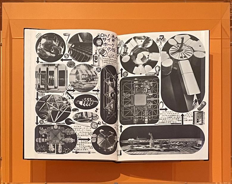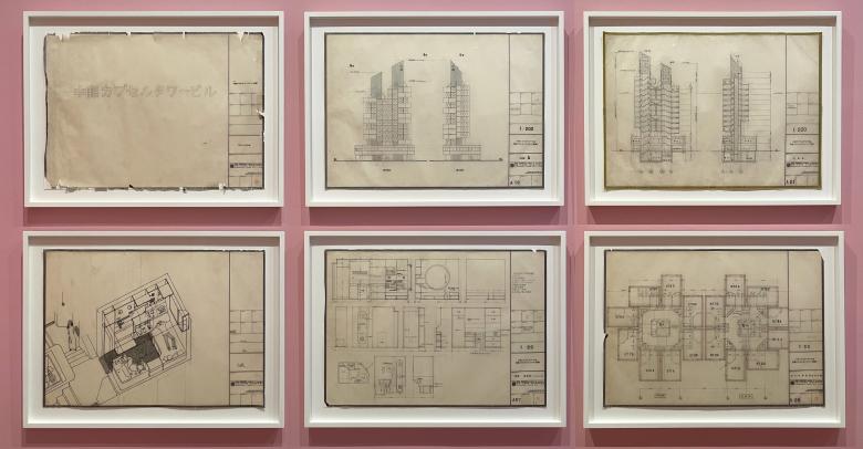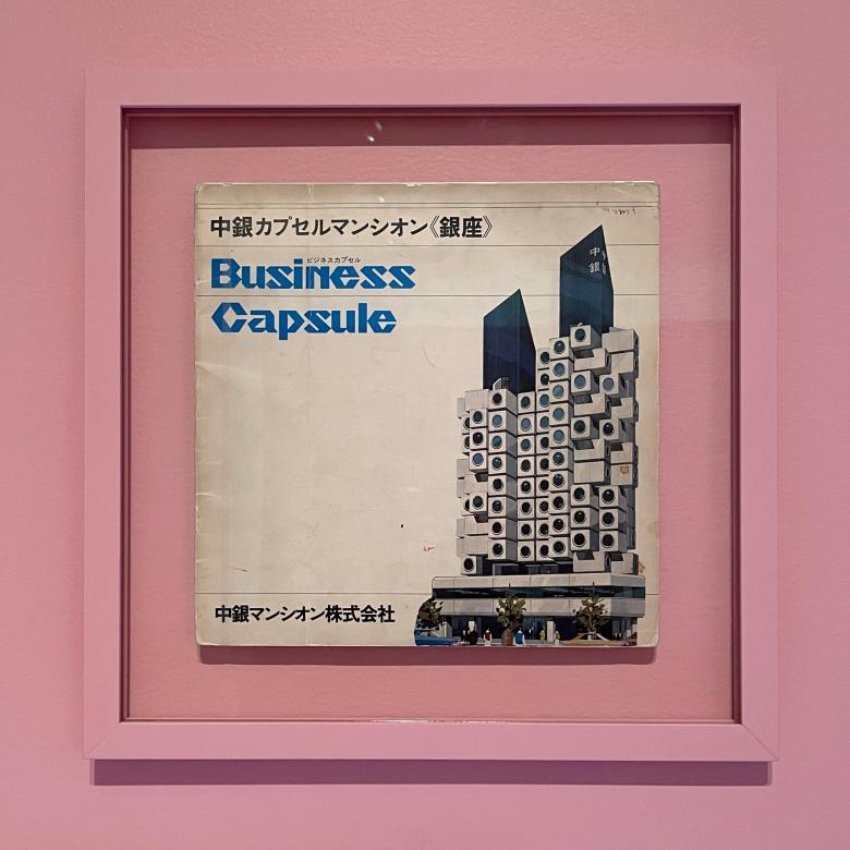 In addition to documents on the design and construction of Nakagin Capsule Tower, the first gallery features artifacts related to the Metabolism movement, including pages from Kisho Kurokawa's 1970 book Capsule, Metabolism, Spaceframe, Metamorphose.
