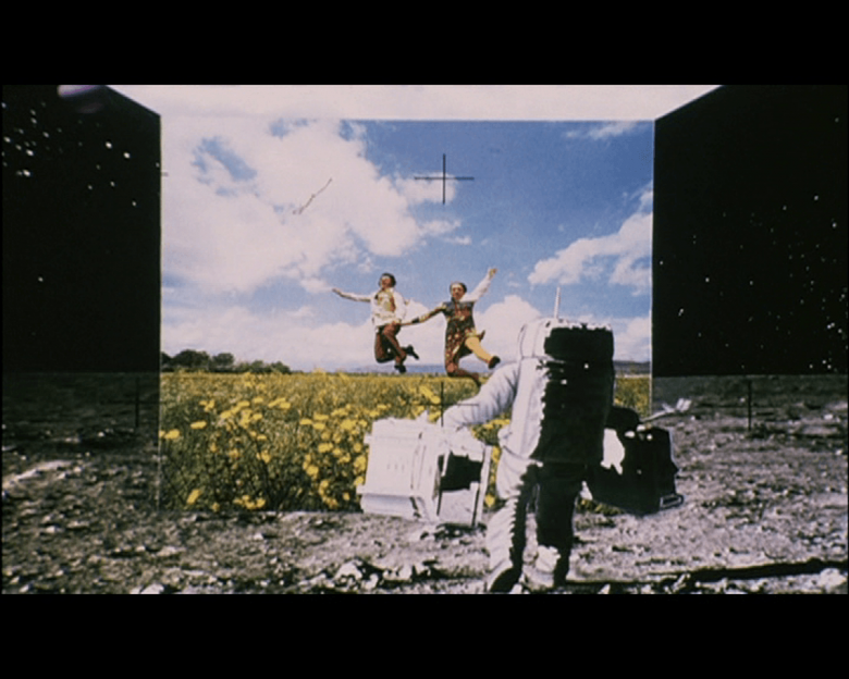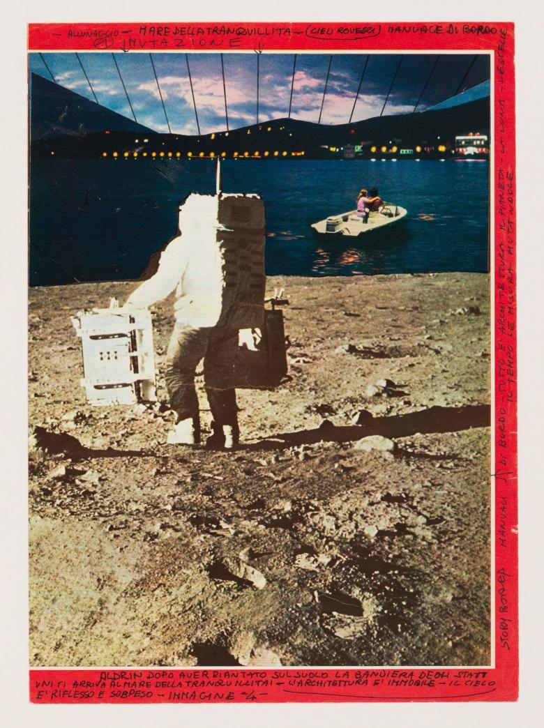 Alessandro Poli. Photomontage on a double-sided magazine spread showing scenes from the moon landing, superimposed with an image of a lake and boating vacationers on one side, and on the reverse, various annotations and sketches, some with reference to Poli’s thesis work, 1970—1971. Alessandro Poli fonds, CCA. © Alessandro Poli