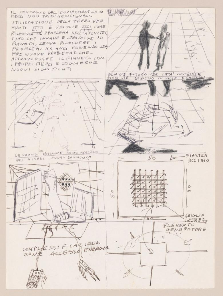 Alessandro Poli. Storyboard describing the materials and energy distribution of the Supersurface universal grid, with sketches of various scenes whose sequence was ultimately altered for the film, 1972. Alessandro Poli fonds, CCA. © Alessandro Poli