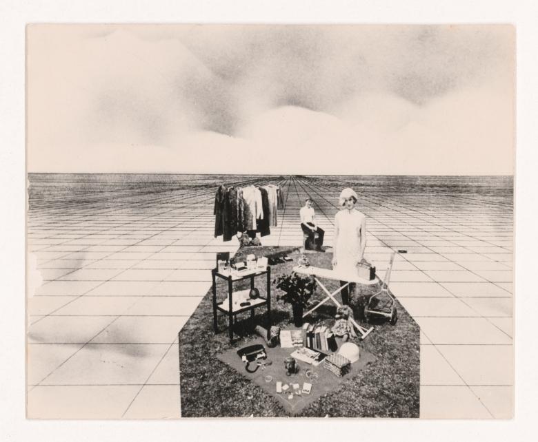 Superstudio. Collage of a woman standing in front of an ironing board with articles of clothing and other domestic objects around her, over an infinite grid surface, demonstrating how the grid replaces all three-dimensional architecture and integrates scenes of daily life, 1972. Alessandro Poli fonds, CCA. © Archivio Superstudio
