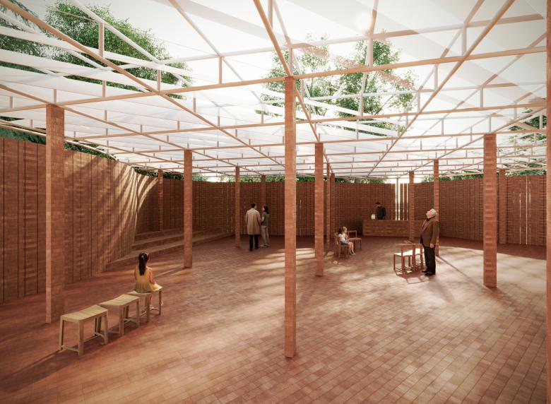 Following from this vernacular reference, LANZA atelier's pavilion appropriately will feature serpentine walls built of simple clay brick, a technique that provides stability through lateral support and uses fewer bricks than orthogonal brick walls. As can be seen in the sketch and renderings here, a curving wall defines three sides of the space beneath a translucent roof, while the wavy brick wall to the south extends beyond the space toward Serpentine South, the 1934 building designed by J. Grey West.