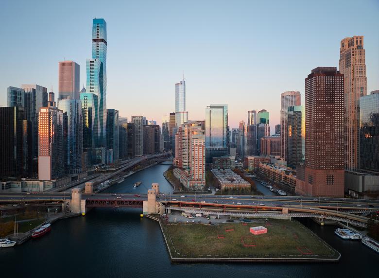 Although the industrial past of the three-acre site meant environmental remediation was a must, that didn't wrap up until late 2012. In the roughly 25 years between the Park District taking over the land and the removal of radioactive soil, plans were made to turn the “park” into a parking lot; artist A. Laurie Palmer called on Chicagoans and foreigners to propose alternative uses for the site; and the unveiling of the 2,000-foot-tall Chicago Spire (then Fordham Spire), designed by Santiago Calatrava, on the other side of LSD in 2005 pointed to the park finally becoming a reality (a completed tower and riverwalk extension would have made pedestrian access to the peninsula easier). One year later, in 2006, the Park District developed a framework plan guiding the themes and landscape elements of a future DuSable Park. Although foundation work on the Chicago Spire made the completion of the park hopeful, the twisting supertall was cancelled in 2010, leaving the site once again untouched. Then, in 2014, soon after the site was remediated, DuSable Park became a staging area for the Navy Pier Flyover, a much-needed lakefront walking and bike path; construction lasted until 2020. Finally, one year after the Flyover was done, the City of Chicago issued an RFP for consultants and, in March 2022, selected a design team for the park: the DuSable Park Design Alliance (DPDA), a joint venture of Brook Architecture, led by RaMona Westbrook, and Ross Barney Architects, led by 2023 AIA Gold Medalist Carol Ross Barney.