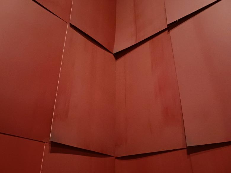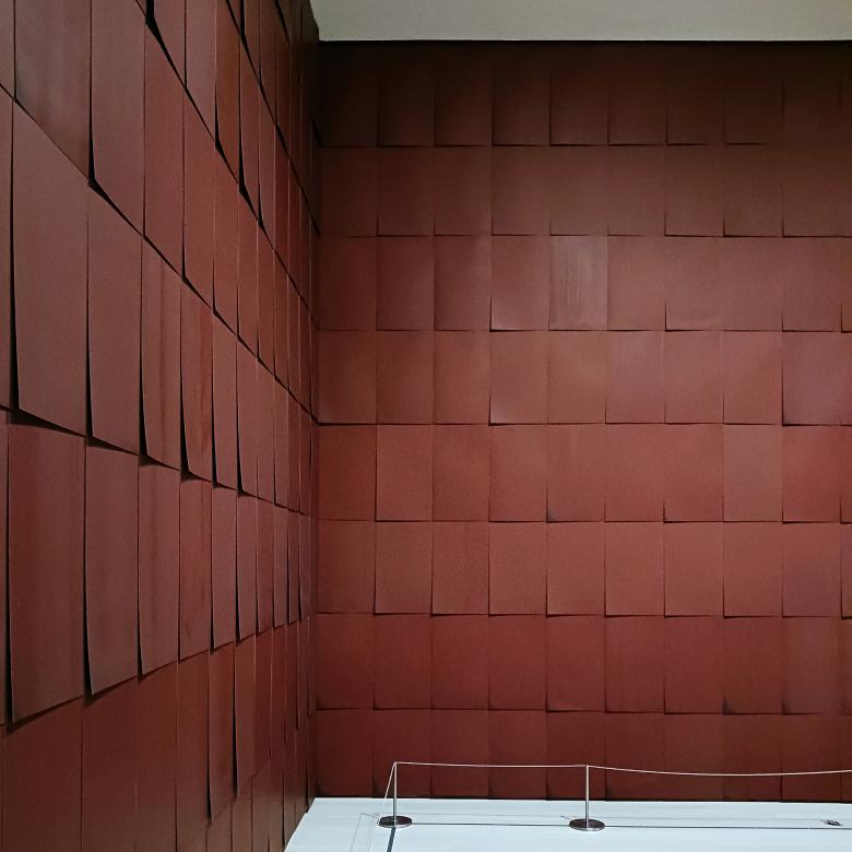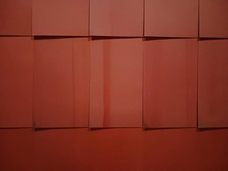 Although the Chocolate Room installation was made especially for the NOW THEN exhibition on the sixth floor of MoMA, the artwork dates back to 1970, when Ruscha was given a room in the US Pavilion at the Venice Art Biennale. He decided to cover the walls of the room with paper “shingles” printed with chocolate. Then — and now — it was an atypical material and artwork for Ruscha, an artist known for oil paintings with words and artist books collecting examples of mundane elements (gas stations, pools, parking lots) in urban environments. While these books endear Ruscha with architects, the same should also apply to Chocolate Room, the immersive room at the heart of NOW THEN, which World-Architects visited earlier today.